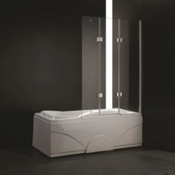 Een mooi design badwand met een dubbele scharnier deur. De badwand bestaat uit 3 delen. Vanaf het punt waar de badwand is bevestigd aan de muur, zit een 50 centimeter breed stuk glas dat vast zit aan het scharnierende deel. De deur bestaat uit twee losse scharnierende delen. U kunt de deur heel eenvoudig naar binnen als naar buiten draaien. Dat maakt het mogelijk dat de rechte badwand ook op een klein bad gemonteerd kan worden.