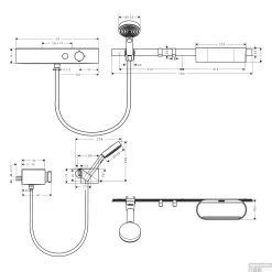Deze bundelset bestaat uit een wandelement (glijstang), handdouche, douchethermostaat, doucheslang, opbergbakje (diep), handdoekhaken (breed) en een schuifstuk.