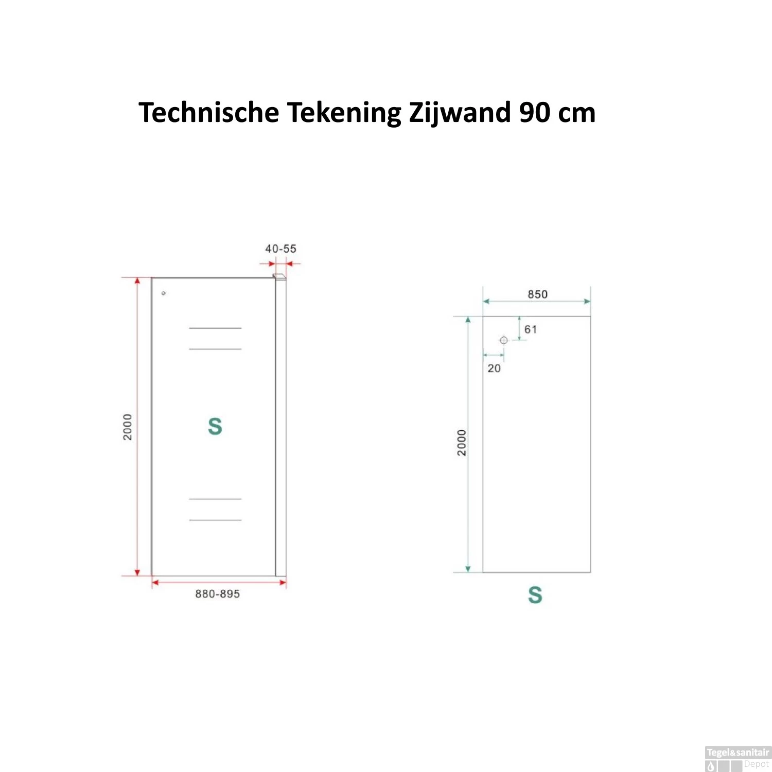Ook de zijwand heeft een breedte van 90 cm en een hoogte van 200 cm. Zowel de nisdeur als de zijwand hebben een glasdikte van 8 mm. De glazen wanden zijn voorzien van een NANO anti-kalk behandeling, die ervoor zorgt dat kalk- en zeepresten zich minder snel aan het glas zullen hechten. Hierdoor heeft het glas van de cabine een lange levensduur en is deze eenvoudig schoon te houden.