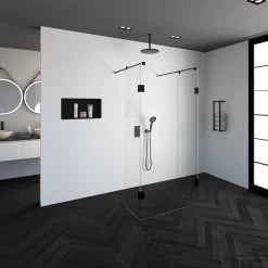 Als u graag minimalisme in uw badkamer wilt, is een doorloopdouche een goede keuze. Deze complete doorloopdouche bestaat uit een doorloopwand met twee vaste zijwanden. De doorloopwand is 100 cm breed en 200 cm hoog. De zijwanden zijn beide ongeveer 50 cm breed. Inclusief glasbehandeling. Deze doorloopdouche straalt luxe en rust uit door zijn design en Mat Zwartkleur accenten.