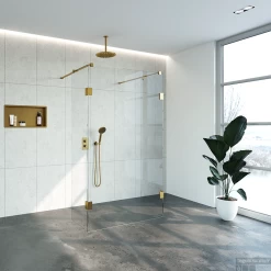 Als u graag minimalisme in uw badkamer wilt, is een doorloopdouche een goede keuze. Deze complete doorloopdouche bestaat uit een doorloopwand met twee vaste zijwanden. De doorloopwand is 120 cm breed en 200 cm hoog. De zijwanden zijn beide ongeveer 50 cm breed. Inclusief glasbehandeling. Deze doorloopdouche straalt luxe en rust uit door zijn design en Goudkleur accenten.