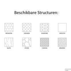 De Texence douchebakken zijn leverbaar te verkrijgen diverse texturen en kleuren. Deze douchebak is leverbaar in de kleuren wit, licht grijs, crème, bruin en zwart. Naast douchebakken met een Smooth-patroon zijn deze douchebakken bovendien ook leverbaar in Squama-, Hexagon-, Slate-, Diamond-, Stone-, Canvas én Braided-patronen.