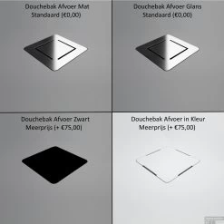 Voor een meerprijs van €75,00 heeft u bovendien de keuze om een zwarte afvoer te kiezen óf om een afvoer aan te schaffen die meegeleverd is in de kleur van de douchebak: keuze genoeg dus om deze bijzondere douchebak compleet te maken!