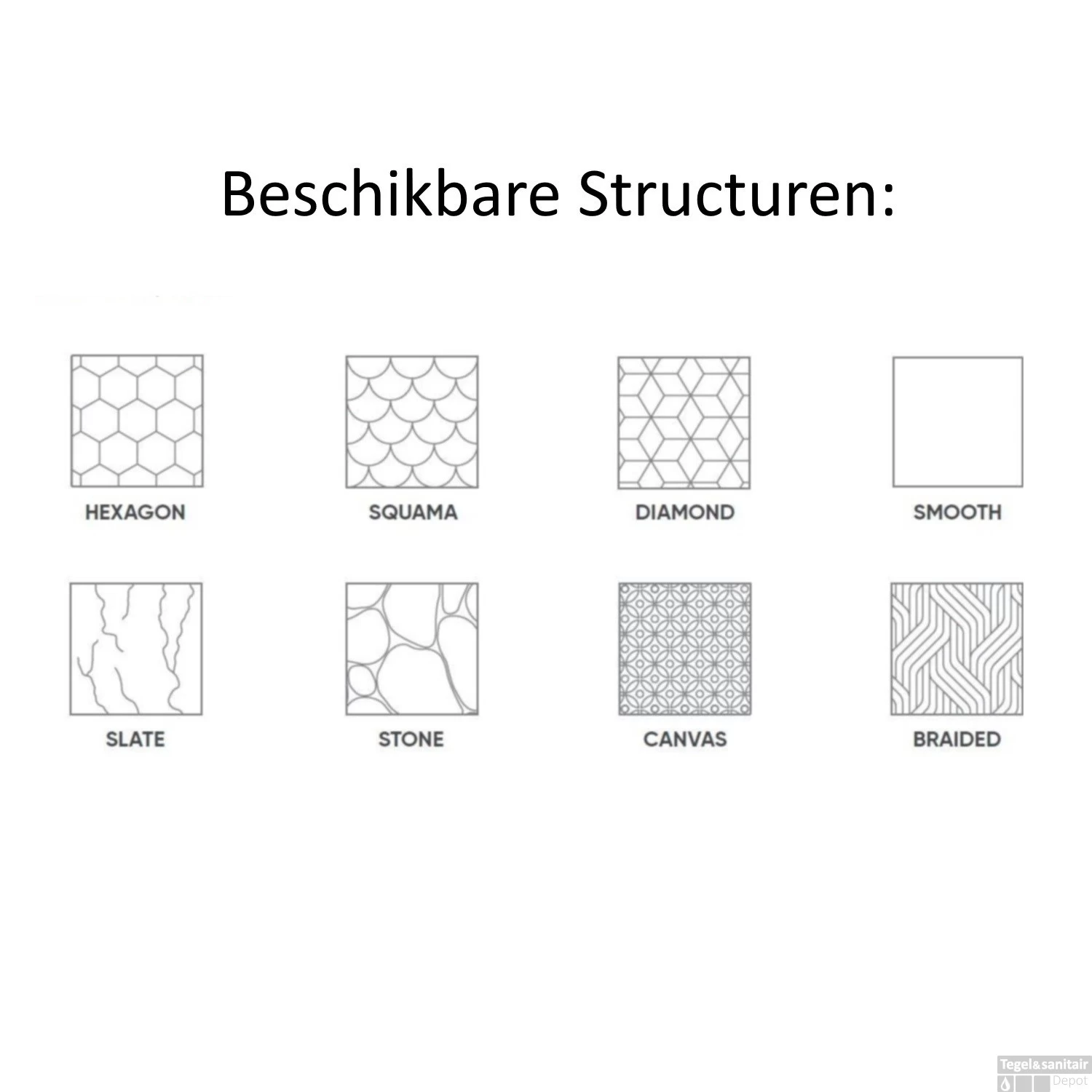 De Texence douchebakken zijn te verkrijgen in diverse texturen en kleuren. Deze douchebak is leverbaar in de kleuren wit, licht grijs, crème, bruin en zwart. Naast douchebakken met een Squama-patroon zijn deze douchebakken bovendien ook leverbaar in Hexagon-, Diamond-, Slate-, Stone-, Canvas- én Braided-patronen.