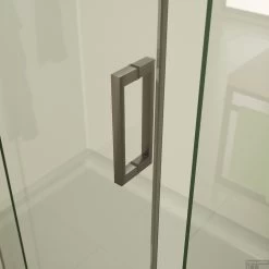 U kunt de douchecabine betreden door middel van een schuifdeur die zowel naar links als rechts te openen is. Bovenin de deur bevinden zich rollen. Deze rollen glijden over het rails en zorgen ervoor dat de deur makkelijk geopend en gesloten wordt. Onderaan de deur bevindt zich een deurgeleider, zodat de schuifdeur stabiel blijft.