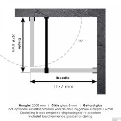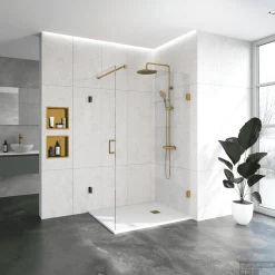 Deze complete douchecabine bestaat uit een inloopwand en een draaideur met Goud beslag. Inclusief glasbehandeling en optionele kunststof profielen. De hoogte van de douchecabine is 200 cm. De cabine is 117,7 cm breed en 87,9 cm diep. Deze douchecabine straalt luxe uit door zijn design en kleur.