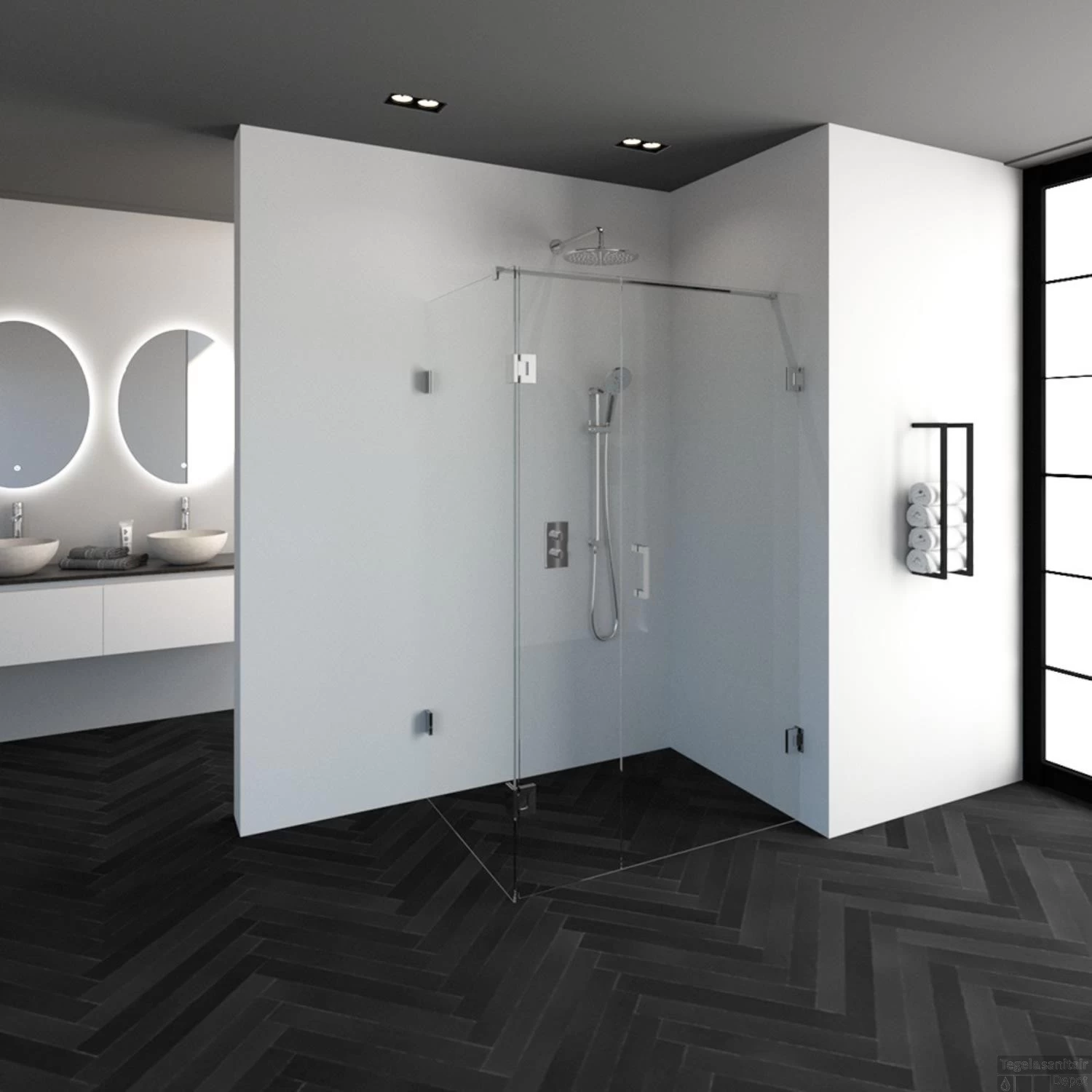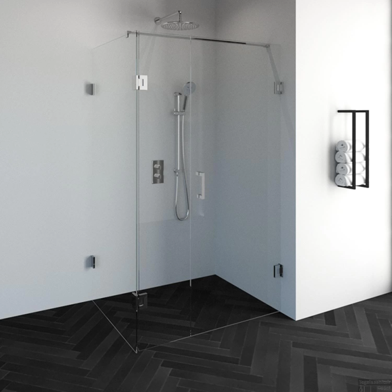 Deze complete douchecabine bestaat uit een inloopwand, draaibare zijwand en draaideur met chroom beslag. Inclusief glasbehandeling en optionele kunststof profielen. De hoogte van de douchecabine is 200 cm. De cabine is 87,7 cm breed en 118,8 cm diep. Deze douchecabine straalt luxe uit door zijn design en kleur.