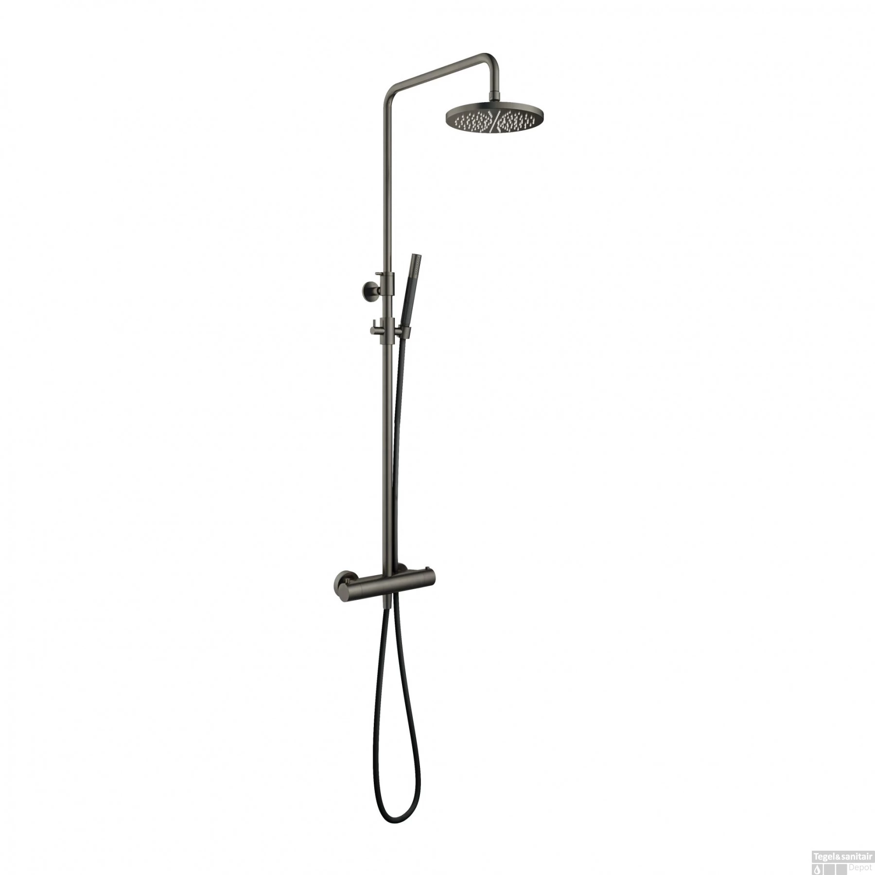 Deze Cobber set in de kleur Verouderd IJzer bestaat uit een opbouwthermostaat, doucheslang van 150 cm, een stortdouchestang, een luxe ronde handdouche en een ronde hoofddouche met een diameter van 30 cm. Een extra luxe hoofddouche dus vanwege de grote afmeting, voor een optimale beleving. Bij deze set komt ook een ronde handdouche in plaats van de standaard staafdouche. Met de thermostatische kraan is de temperatuur makkelijk in te stellen. U kiest zelf hoe warm u het water wilt hebben.