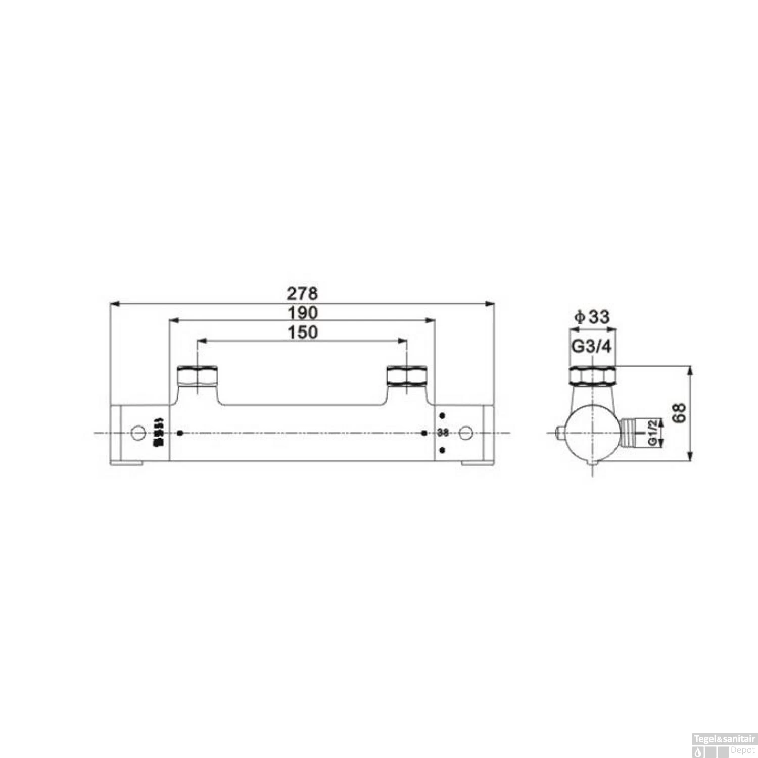 De kraan heeft een breedte van 27.8 cm en een diepte van 6.8 cm. Onder aan de kraan kunt u eenvoudig een doucheslang aansluiten op de universele 1/2” aansluiting.