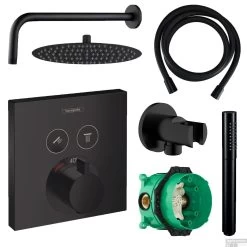 Ervaar maximaal doucheplezier met deze inbouw doucheset uit de Select collectie van HansGrohe. Deze set bestaat uit een hoofddouche, handdouche, thermostaat, inbouwdeel, wandaansluiting, douchehouder en doucheslang. De volledige set heeft een zwarte kleur. Bij deze set heeft u de keuze in de grote van de hoofddouche. U kunt hierbij kiezen tussen een diameter van 20cm en 30cm. Bij deze regendoucheset wordt staandaard een handdoucheset meegeleverd.