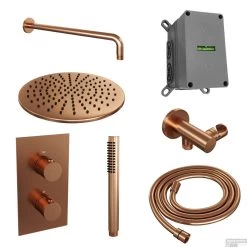 De set bestaat uit een inbouwthermostaat, een afbouw deel van de thermostaat kraan, een wandarm, een hoofddouche met een diameter van 30 cm, een handdouche inclusief wandarm en doucheslang. De thermostaatkraan, met 3/4” aansluiting, is eenvoudig te bedienen door de twee knoppen. Met de onderste knop kunt u eenvoudig de temperatuur van het water instellen. De thermostaat beschikt over een kinderbeveiliging bij 38 graden, waardoor u nooit per ongeluk onder een kokend hete douche zat staan. met de bovenste knop bepaalt u de gewenste douchstand en kunt u switchen tussen de hoofd- en handdouche.