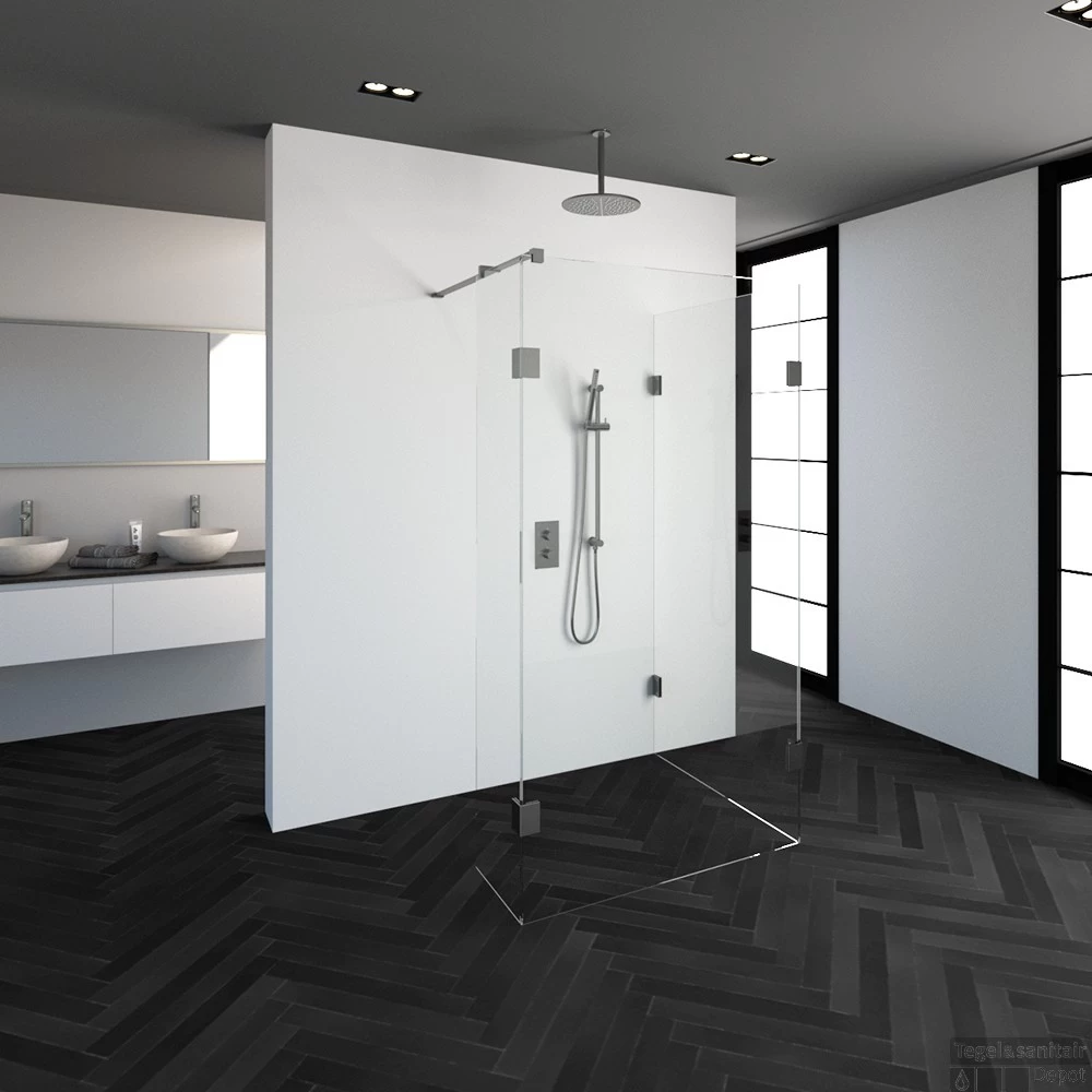 Deze complete inloopdouche bestaat uit twee inloopwanden en en een zijwand met RVS beslag. Inclusief glasbehandeling. De hoogte van de inloopdouche is 200 cm. Hij is 108,3 cm breed en 97,7 cm diep. Deze inloopdouche straalt luxe uit door zijn design en kleur.