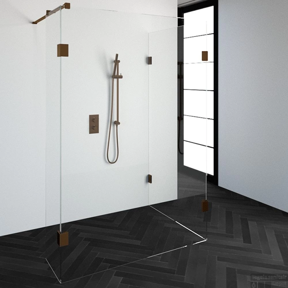 Deze complete inloopdouche bestaat uit twee inloopwanden en en een zijwand met koper beslag. Inclusief glasbehandeling. De hoogte van de inloopdouche is 200 cm. Hij is 98,3 cm breed en 97,7 cm diep. Deze inloopdouche straalt luxe uit door zijn design en kleur.
