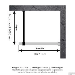Deze complete inloopdouche bestaat uit een inloopwand en RVS beslag. Inclusief glasbehandeling. De hoogte van de inloopdouche is 200 cm. De cabine is 107,7 cm breed en maximaal 200 cm diep. Deze inloopdouche straalt luxe uit door zijn design en kleur.