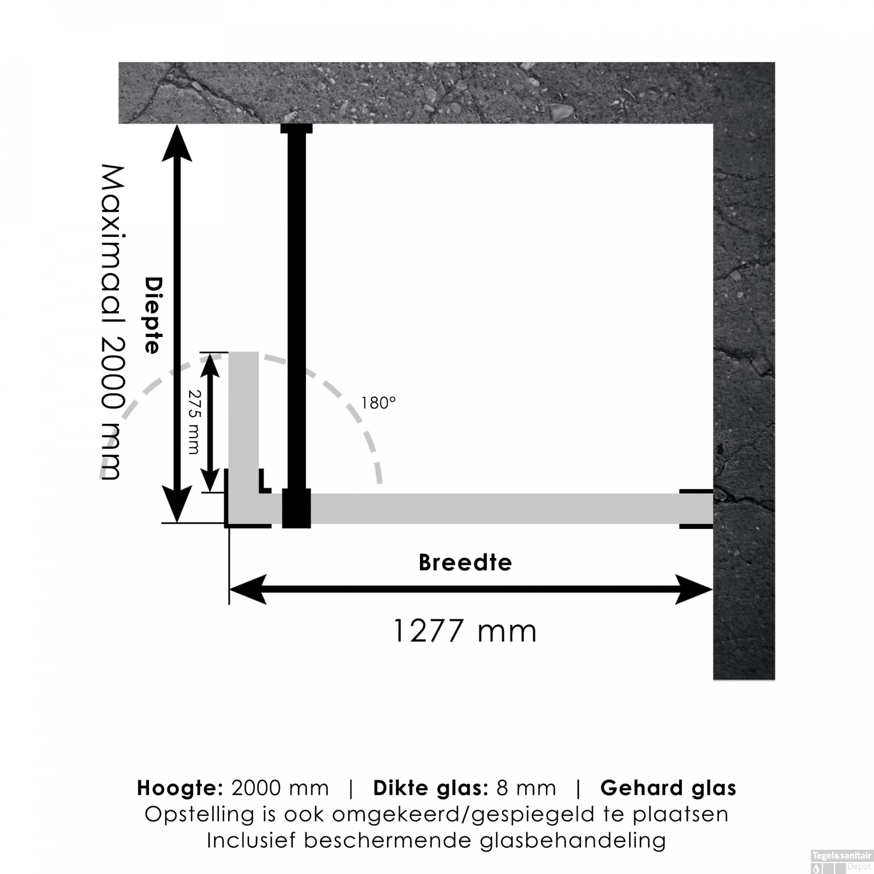 Deze complete inloopdouche bestaat uit een inloopwand en een draaibare zijwand met Chroom beslag. Inclusief glasbehandeling en optionele kunststof profielen. De hoogte van de inloopdouche is 200 cm. Hij is 127,7 cm breed en maximaal 200 cm diep. Deze inloopdouche straalt luxe uit door zijn design en kleur.