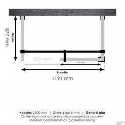 Deze complete inloopdouche bestaat uit twee inloopwanden van 90 cm en één van 57,5 cm. Inclusief glasbehandeling. De hoogte van de inloopdouche is 200 cm. Hij is 119,1 cm breed en 87,7 cm diep. Deze inloopdouche straalt luxe uit door zijn design en kleur.