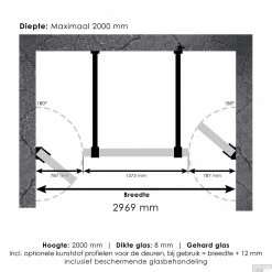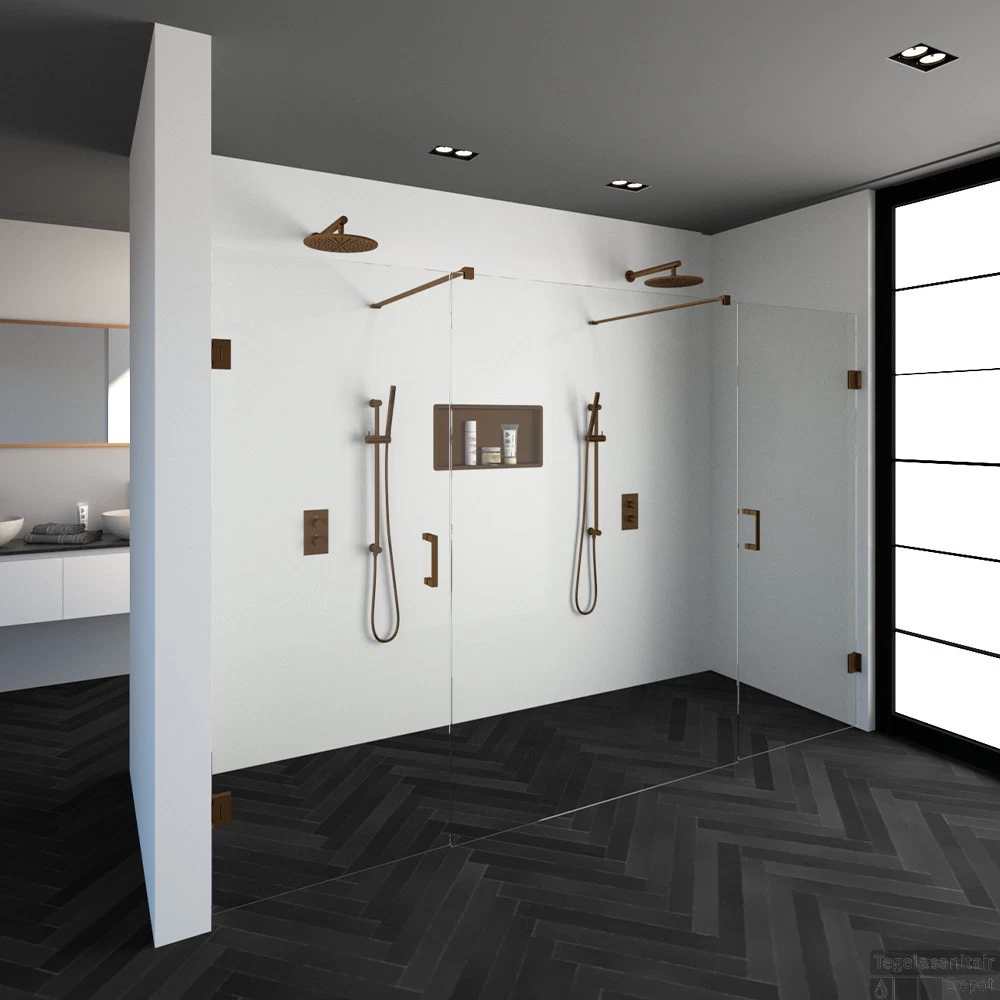 Deze complete niscabine bestaat uit een vrijstaande doorloopwand met twee draaideuren met Koper beslag. Inclusief glasbehandeling en optionele kunststof profielen. De hoogte van de niscabine is 200 cm. Deze niscabine is modern straalt luxe uit door zijn design en kleur.