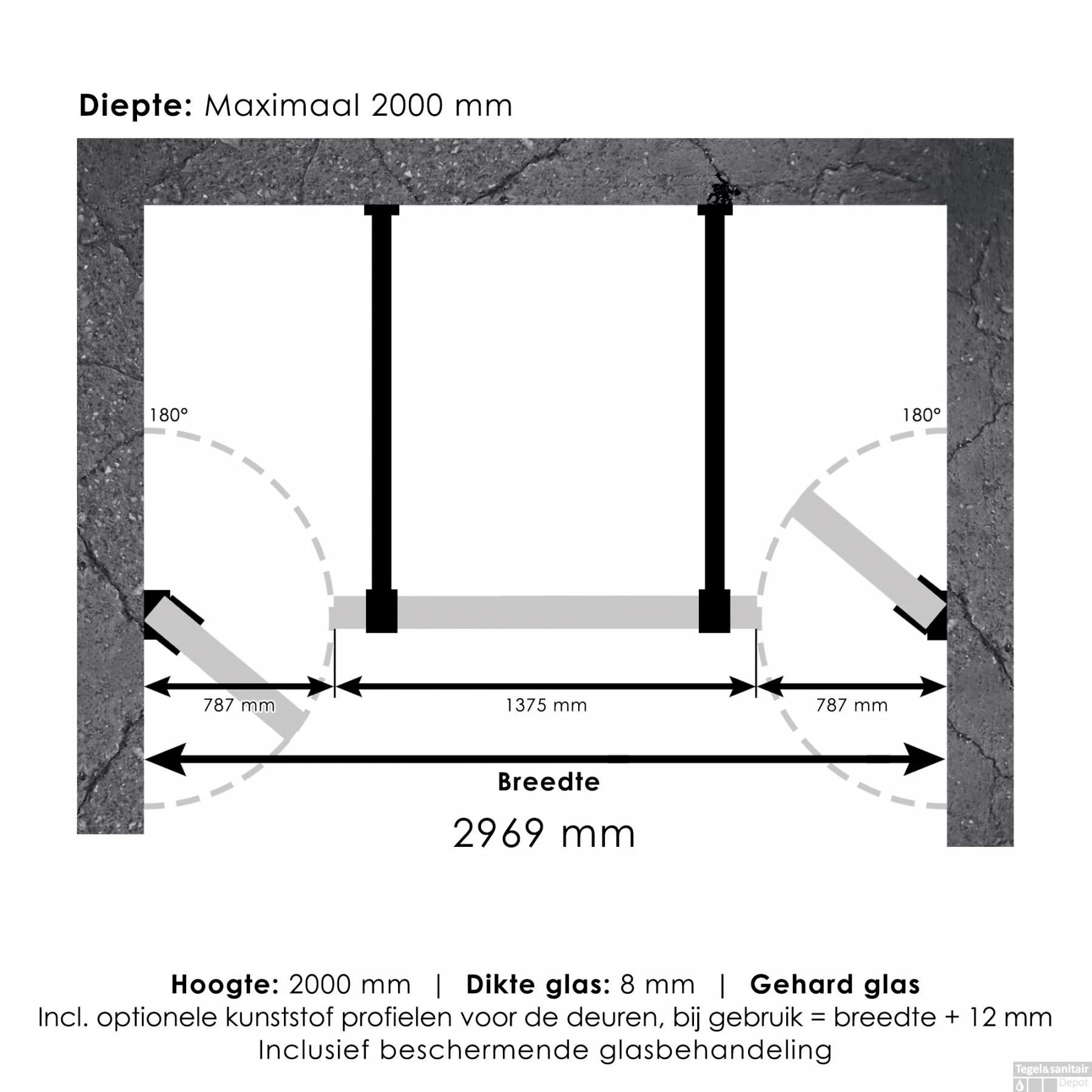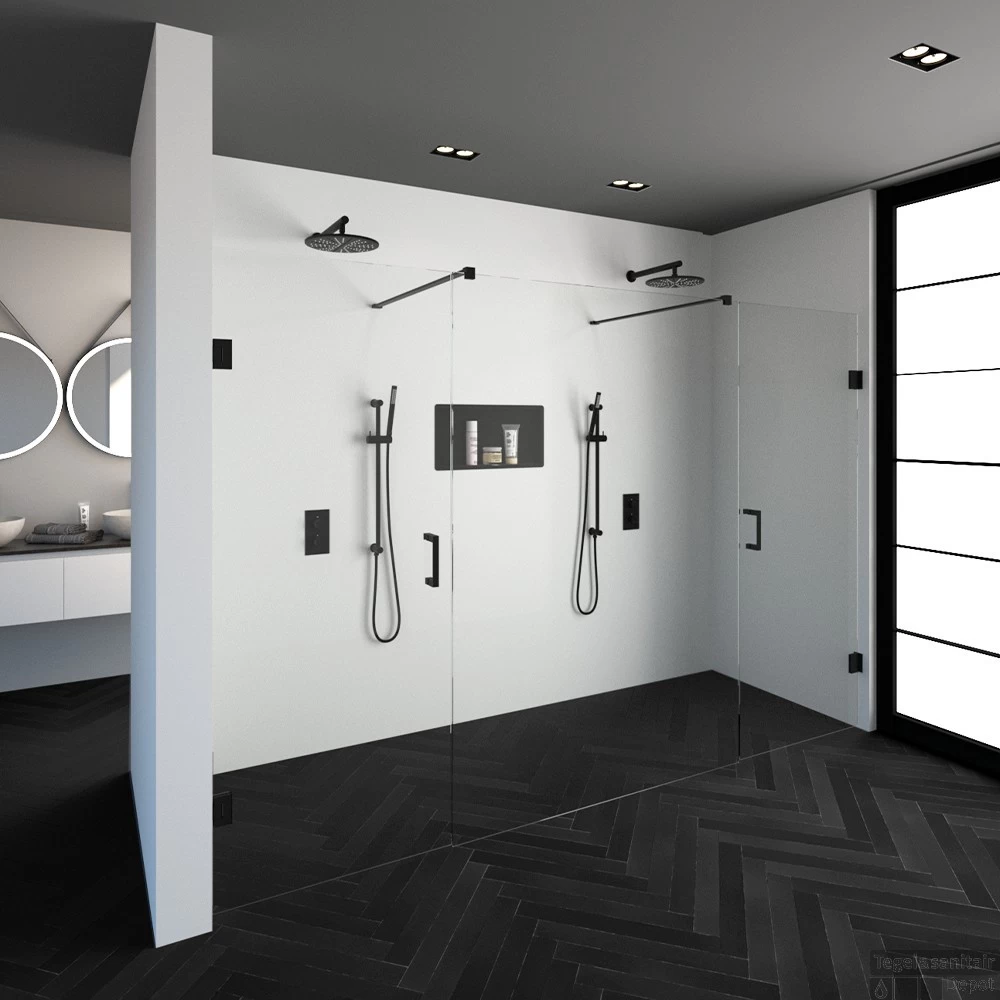 Deze complete niscabine bestaat uit een vrijstaande doorloopwand met twee draaideuren met Mat Zwart beslag. Inclusief glasbehandeling en optionele kunststof profielen. De hoogte van de niscabine is 200 cm. Deze niscabine is modern straalt luxe uit door zijn design en kleur.