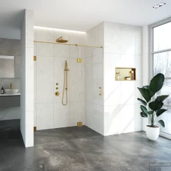 Deze complete nisdeur bestaat uit een inloopwand en draaideur met Goud beslag. Inclusief glasbehandeling en optionele kunststof profielen. De hoogte is 200 cm. Deze nisdeur straalt luxe uit door zijn design en kleur. De draaideur wordt met een glasscharnier bevestigd op de inloopwand.
