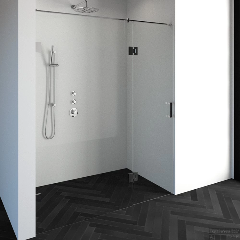 Deze complete nisdeur bestaat uit een inloopwand en draaideur met Chroom beslag. Inclusief glasbehandeling en optionele kunststof profielen. De hoogte is 200 cm. Deze nisdeur straalt luxe uit door zijn design en kleur. De draaideur wordt met een glasscharnier bevestigd op de inloopwand.