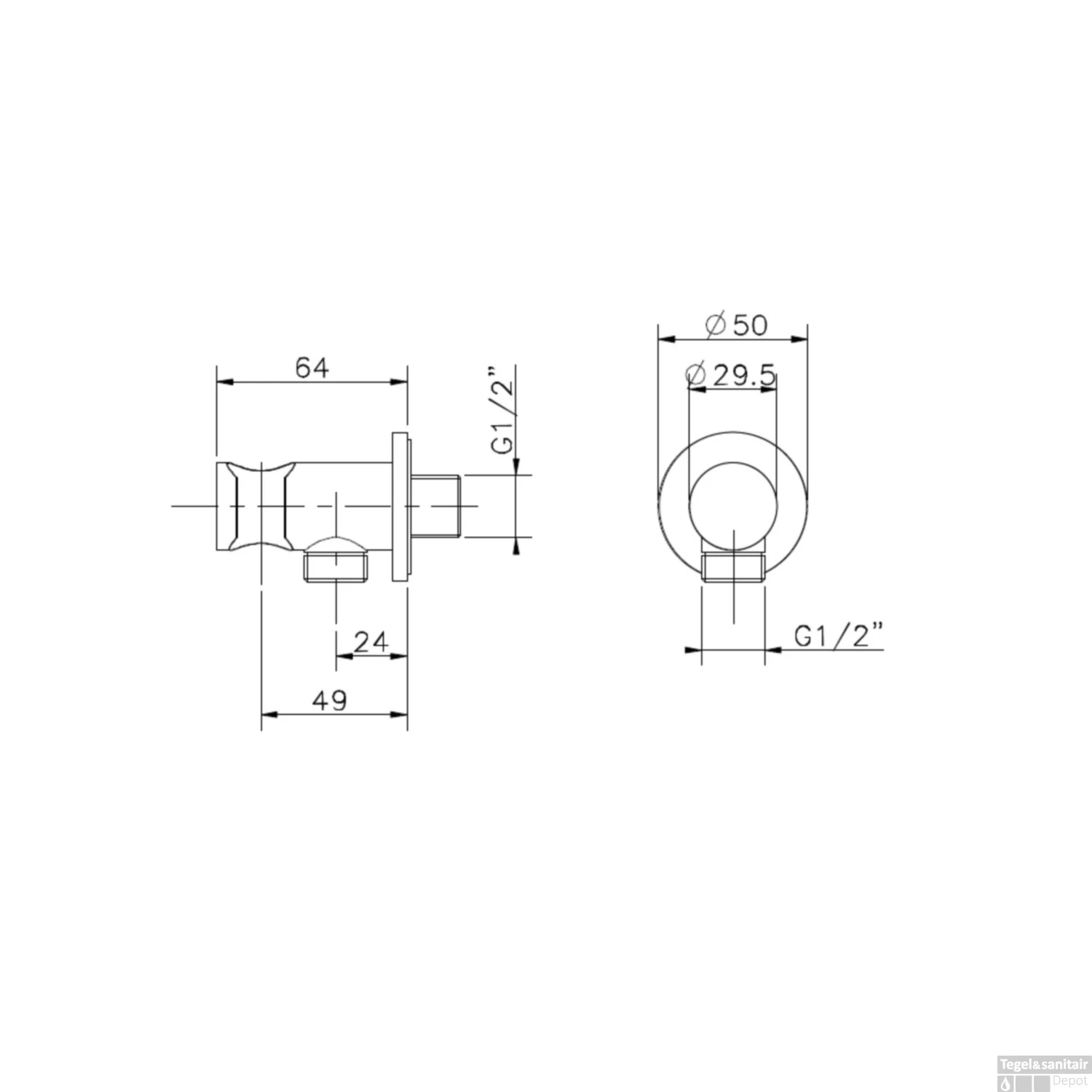 Onderaan zit een wateruitlaat waar de 1/2 doucheslang aansluiting aan bevestigd kan worden. Het water stroomt dan van de houder via de slang naar de handdouche.