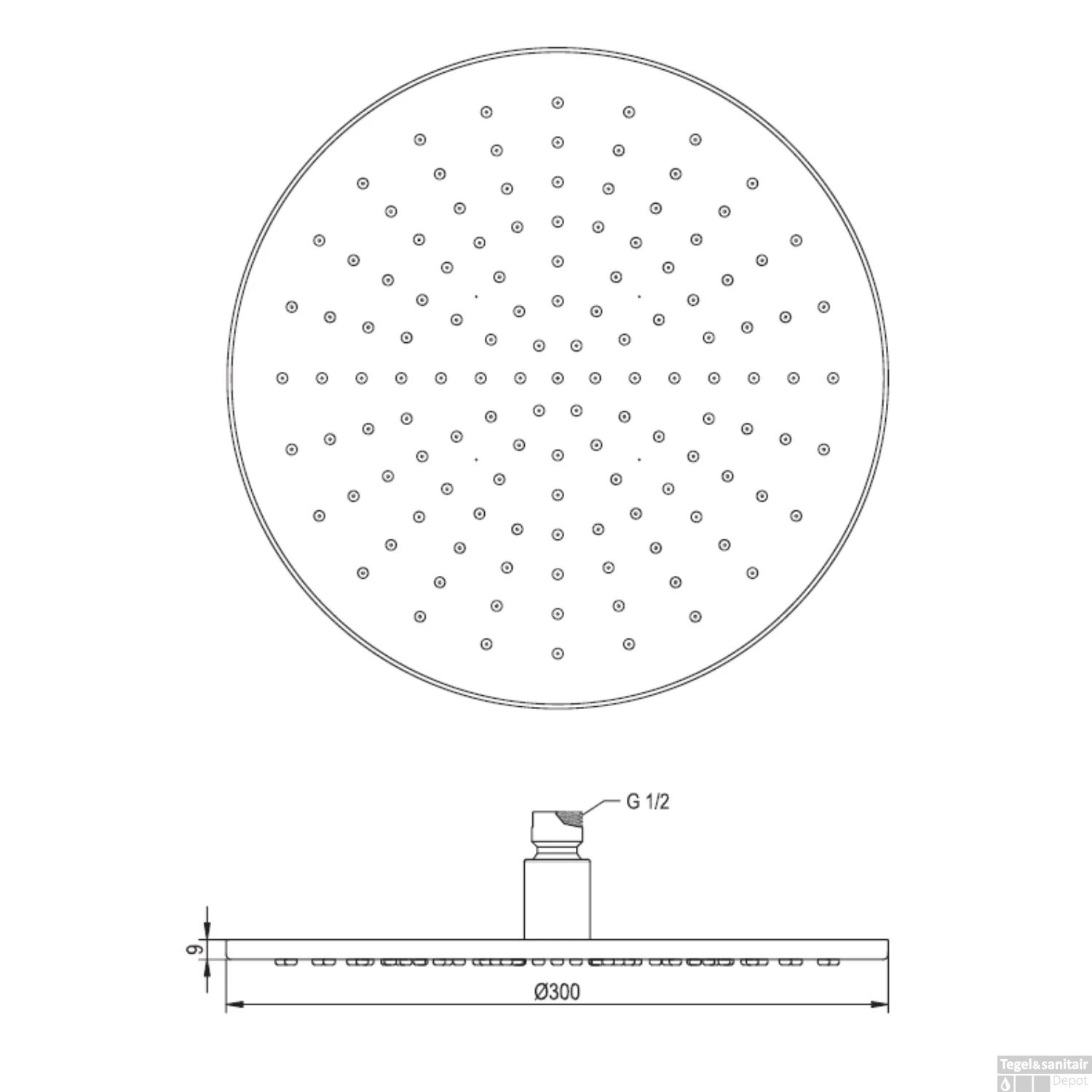 De douchekop is 30 cm en heeft 1 stand. Hij is van RVS is de kleur geborsteld Gunmetal.