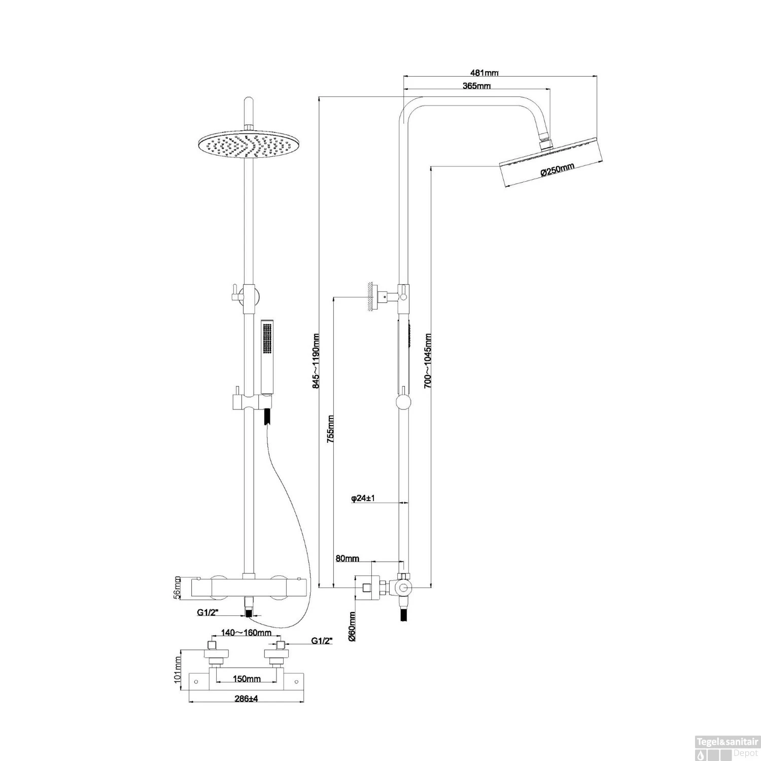 Specificaties Regendouche Opbouwset Thermostatisch 25cm Zwart