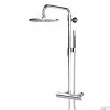 Deze set bestaat uit een complete opbouw regendoucheset met thermostaatkraan, handdouche (met 3 standen) en regendouche van 30 cm. De thermostaatkraan is eenvoudig te bedienen. Met de linkerdraaiknop bepaalt u de gewenste douchestand en daarmee wisselt u tussen hoofd- en handdouche. Met de rechter draaiknop stelt u de gewenste watertemperatuur in. Deze knop is voorzien van temperatuurblokkering bij 38°C, zodat de kraan voor iedereen veilig te gebruiken is. De glijstang is verstelbaar tussen 95 en 140 cm