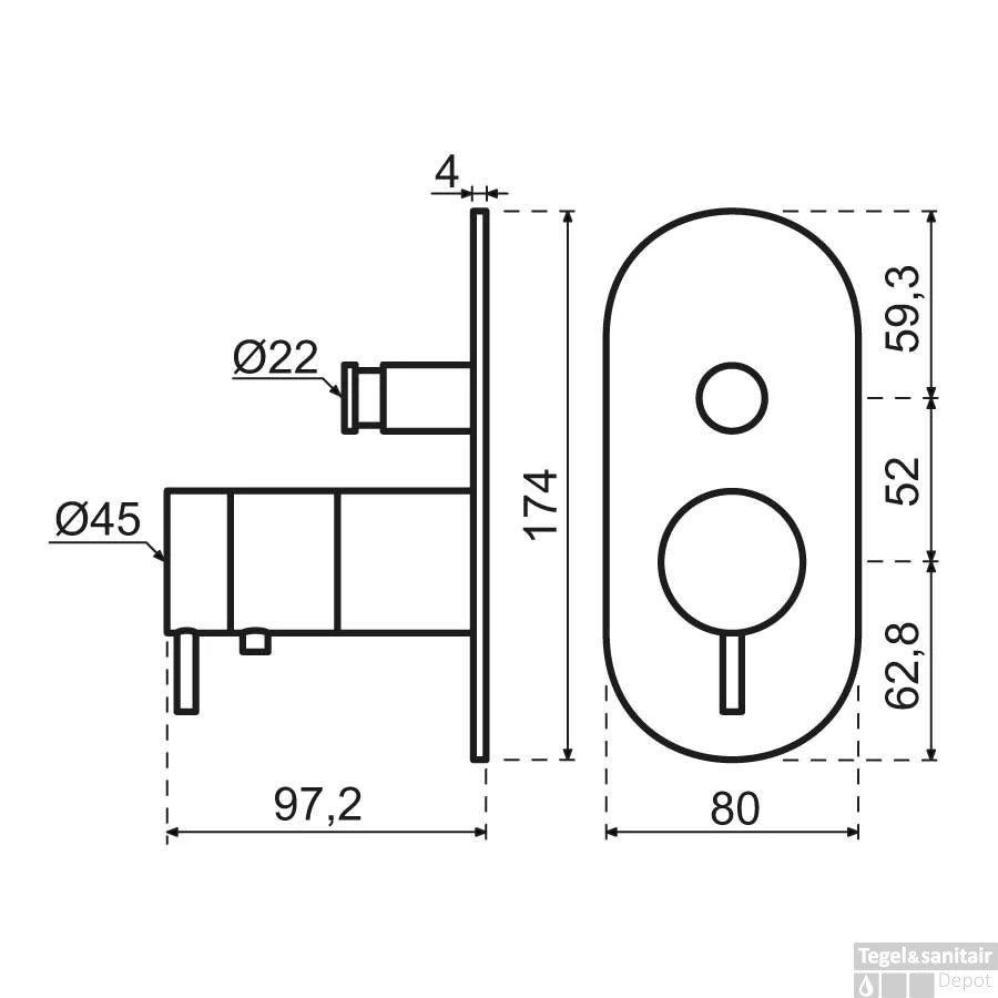 Stijlvol en strak, de ovale Flow thermostatische inbouwkraan geeft u controle over uw douchesysteem met een simpele druk op de knop wisselt u tussen de hand- en hoofddouche (2-weg), met de onderste stelt u de juiste temperatuur in. Inclusief thermostatische inbouwkraan met een staafhanddouche en wand-arm met een hoofdouche met een diameter van 250mm. Inclusief inbouwmodule met een inbouwdiepte van slechts 55mm. De module is daarom in bijna alle situaties te plaatsen.