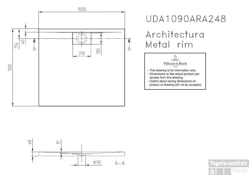Villeroy & Boch Architectura Metal Rim Douchebak 100x90x4.8 Cm. Wit
